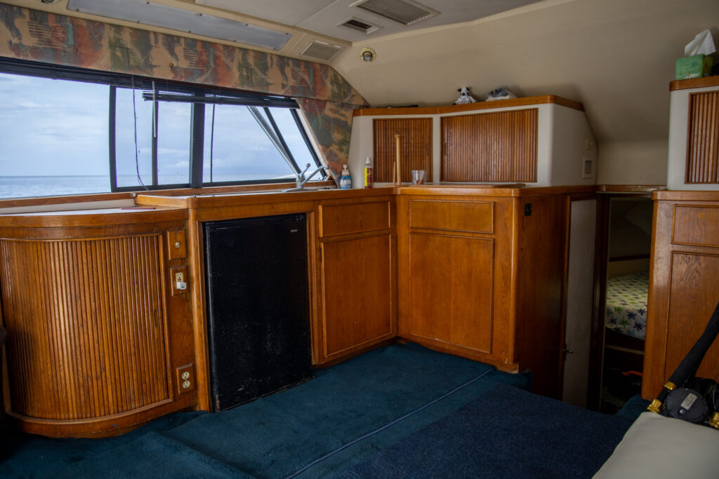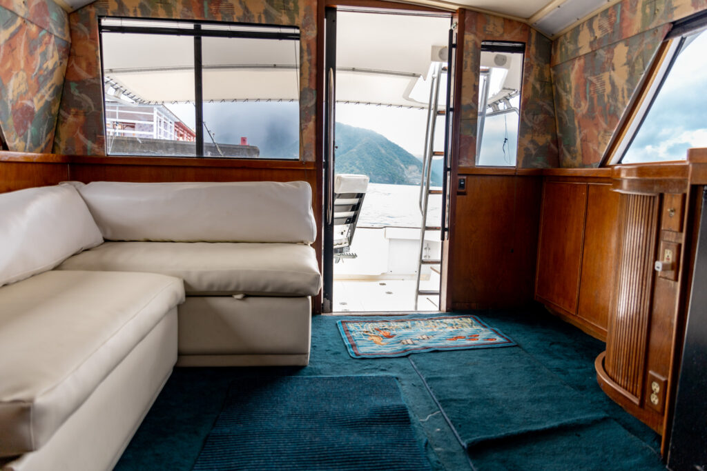 There is also a marine head / washroom with shower.  She has comfortable seating and fully air conditioned interior.